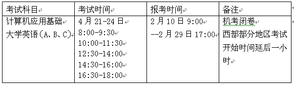 (1)《计算机应用基础》、《大学英语》(A、B、C)四门统考课程采用混编考场方式。具体报考时间如下: