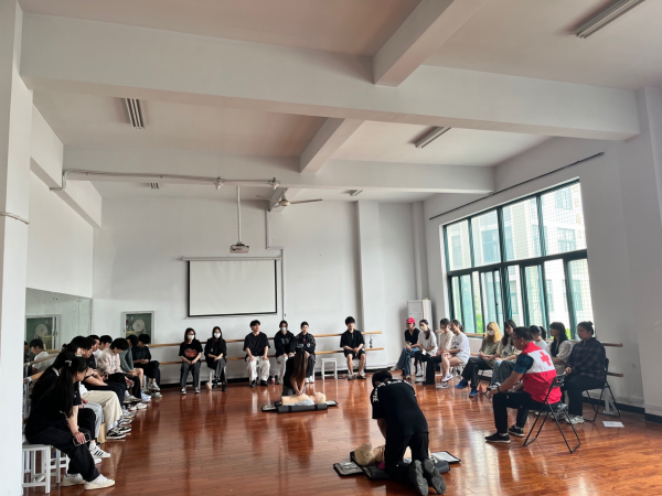近日,管理学院200余名学生在行政楼二楼大厅参加了由杭州市红十字会组织的应急救护员培训。