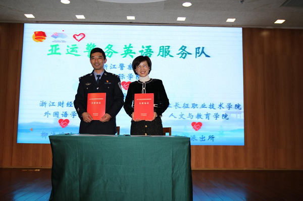 “2022亚运会警务英语服务队”是由杭州市公安局西湖风景名胜区分局下属各派出所以及合作高校共同参与的团建联合体,形成资源共享、优势互补、同创共建的整体合力,旨在更好地服务2022年杭州亚运会双西景区安保工作,强化双西警队警务素质,提升亚运警务英语服务能力。人文与教育学院商务英语专业与岳庙派出所结成了共建团队,将于2022年3月—2022年12月间为岳庙所提供外语支撑,并在其涉外案件办理遇到外语沟通方面困难时给予帮助。此外,商务英语专业师生也将参加由岳庙所开展的各类相关亚运会志愿服务活动,并将在原“警务英语教学实践”的基础上,结合亚运主题,开发更多、更新、更深的教学实践项目。