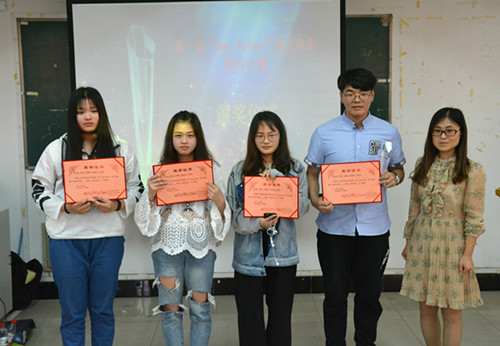 4月19日下午,我院首届“Our Voice”英文配音大赛在2218教室落下帷幕。本次大赛共评出一等奖一个,二等奖两个,三等奖两个,16级国贸专业陈立斌组获得一等奖,二等奖被16级财务管理专业梅一博组和16级会计专业金女组摘得,获得三等奖的是16级统计与会计专业黄晔莹组和16级会计专业郭羽倩组,本次大赛还设置了最佳配音师奖,陈立斌和郑滟煜两位同学表现突出,获得此荣誉。